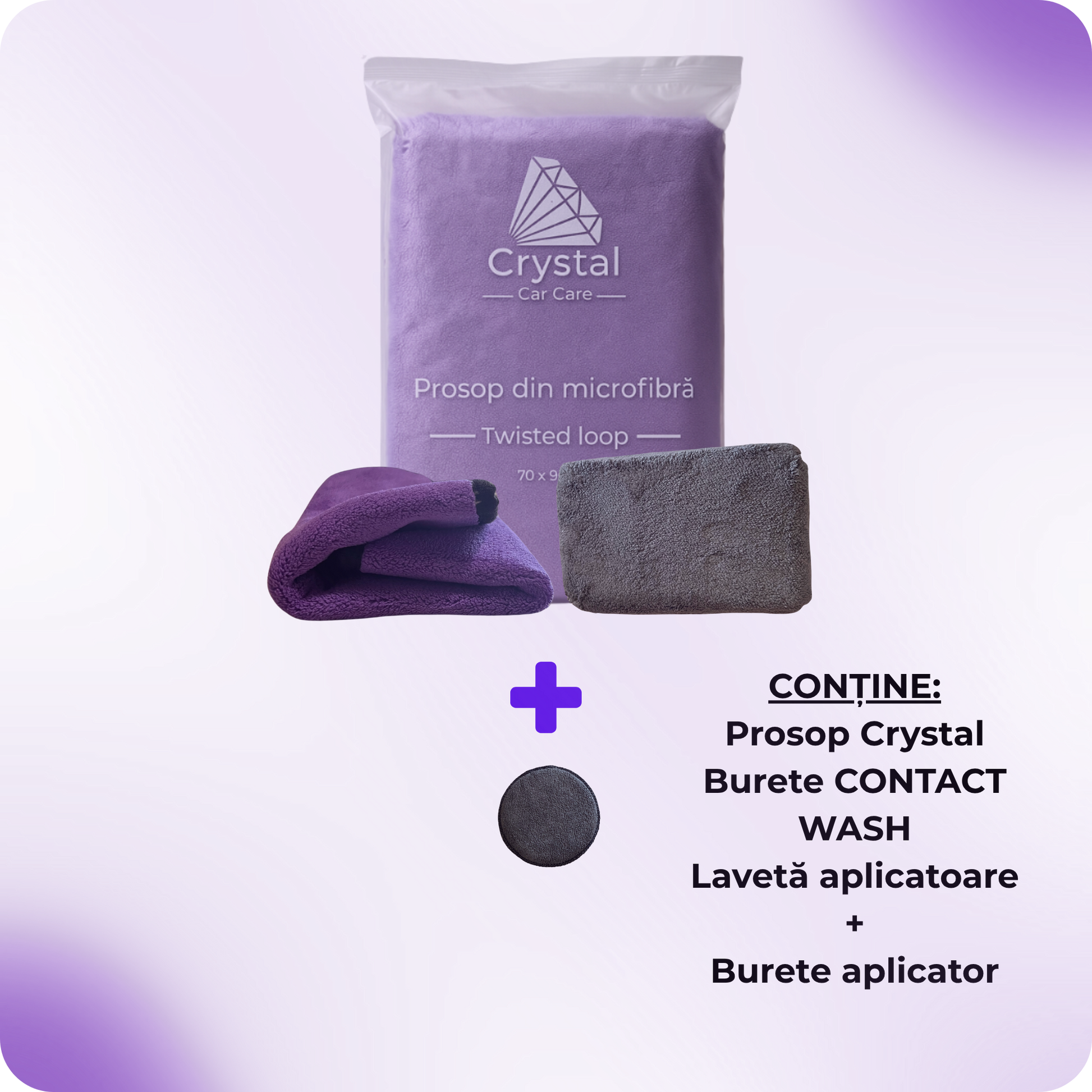 Pachetul conține tot ce ai nevoie pentru o curățare eficientă: prosop Crystal, burete CONTACT WASH, lavetă aplicatoare și burete aplicator.